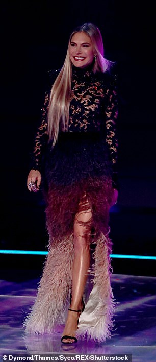 Ayda wowed in a semi-sheer lace number with a statement feathered skirt, which had a daringly high thigh-split up one side.