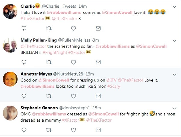 Robbie Williams bore a scarily similar resemblance to Simon Cowell on as he transformed into the music mogul for the Halloween episode of X Factor.