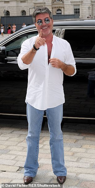 The pop icon, 44, revelled in the spooky time of year by donning a fitted white shirt and boot cut jeans - a signature look for the X Factor boss.