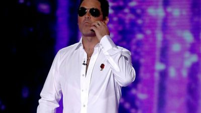 Robbie, introduced by Dermot O'Leary as 'Robbie Cowell', teamed the look with a pair of dark aviator shades, which Simon is rarely seen without, and dyed his hair jet black to mirror his co-stars locks.