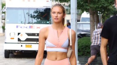 Romee Strijd Flashes Her Sculpted Midriff in Sleeveless Pink Tank Top
