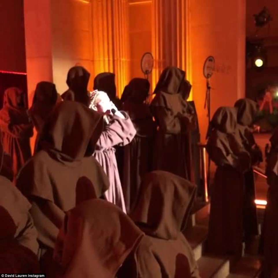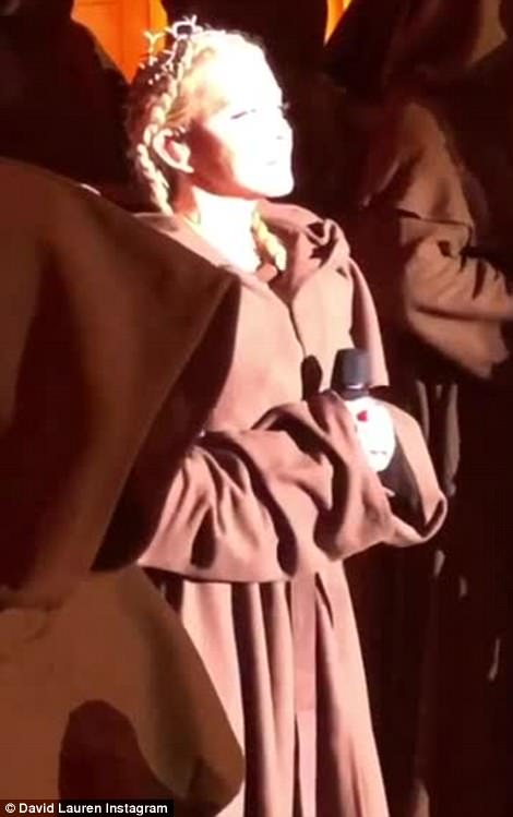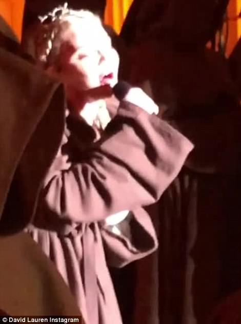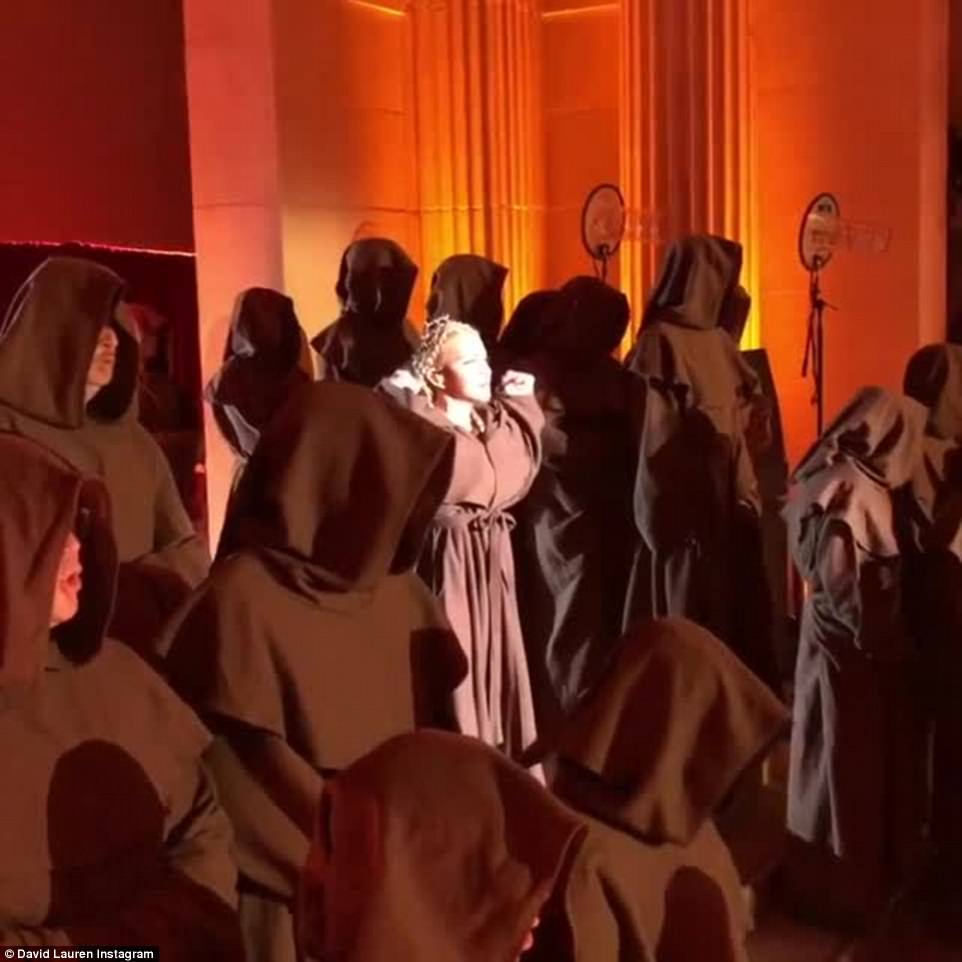 Dramatic: The singer, 59, appeared in the Great Hall at the Metropolitan Museum of Art walking down some steps flanked by monks