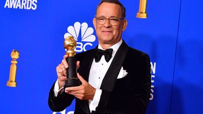 After apologising for his cold, Tom looked at the table at the Beverly Hilton hotel where his wife, Rita Wilson, and their children were sitting, and turned back with tears in his eyes.