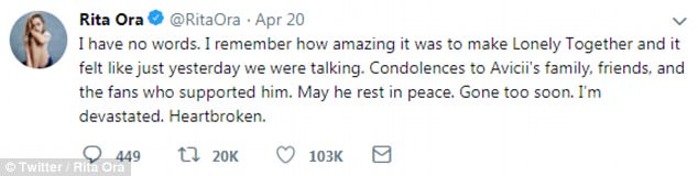 'Heartbroken': Following Avicii's death last Friday, Rita was one of the many celebrities to take to Twitter to pay tribute to the late DJ