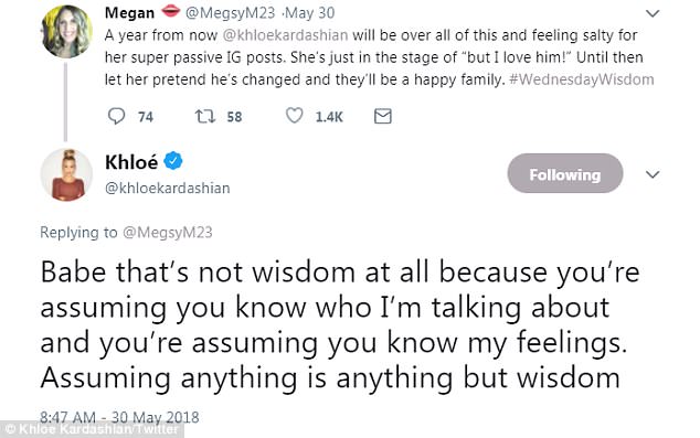 Khloe said in turn, 'Babe, that’s not wisdom at all because you’re assuming you know who I’m talking about and you’re assuming you know my feelings. Assuming anything is anything but wisdom.'