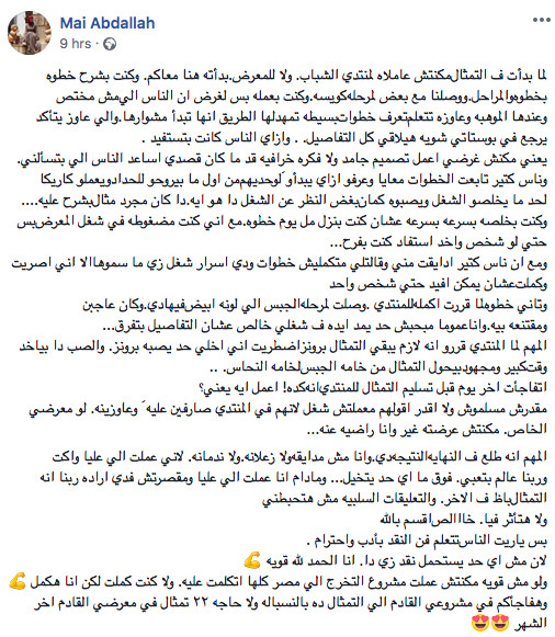 (Translation: When I started working on the statue, it was not for the World Youth Forum, nor the exhibition. It all started here with you. I used to explain the process step-by-step. We reached a good phase together. My goal was to teach those who have the talent the basic steps that can help them start their career. You can see my earlier posts and understand how useful it was.