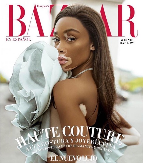 Canadian model Winnie Harlow graces the cover of November’s Harper’s Bazaar en Español wearing a ruffled dress by Lebanese designer Elie Saab.