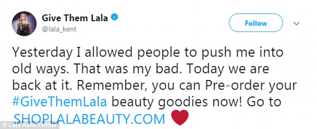 She later wrote, 'Yesterday I allowed people to push me into old ways. That was my bad. Today we are back at it,' before plugging her latest beauty endeavor.