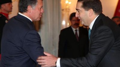 Published December 3rd, 2010 - 06:31 GMT Jordan's Prime Minister Samir Rifai (R) shaking hands with Jordan's King Abdullah after taking the oath of office in Amman on November 24, 2010. King Abdullah once described Jordan as between "Iraq and a hard place." LatestPopular Al-Sharaa targets his own family and punishes senior state officials Petro's Pay and accounts frozen as US sanctions deepen diplomatic rift with Colombia Alperen Duymaz mustache look next to Su Burcu Yazgı Coşkun for Beklenen Mehdi "Abu Lulu" in custody: RSF launches probe into alleged violations in Darfur’s El Fasher İbrahim Çelikkol and Cansu Dere Shine in first poster of Binbir Gece Masalları revealed by tabii Loading content ... Subscribe Sign up to our newsletter for exclusive updates and enhanced content Subscribe Now Subscribe Sign up to get Al Bawaba's exclusive celeb scoops and entertainment news