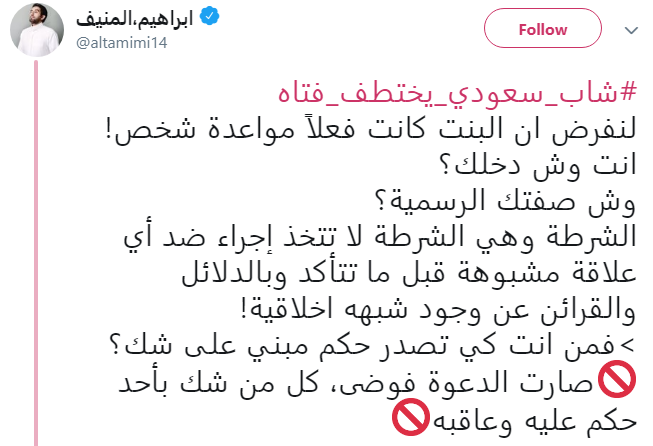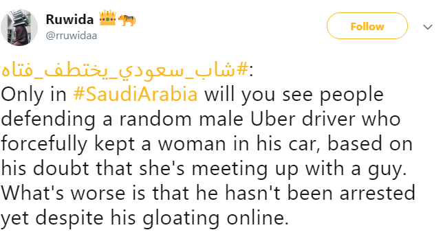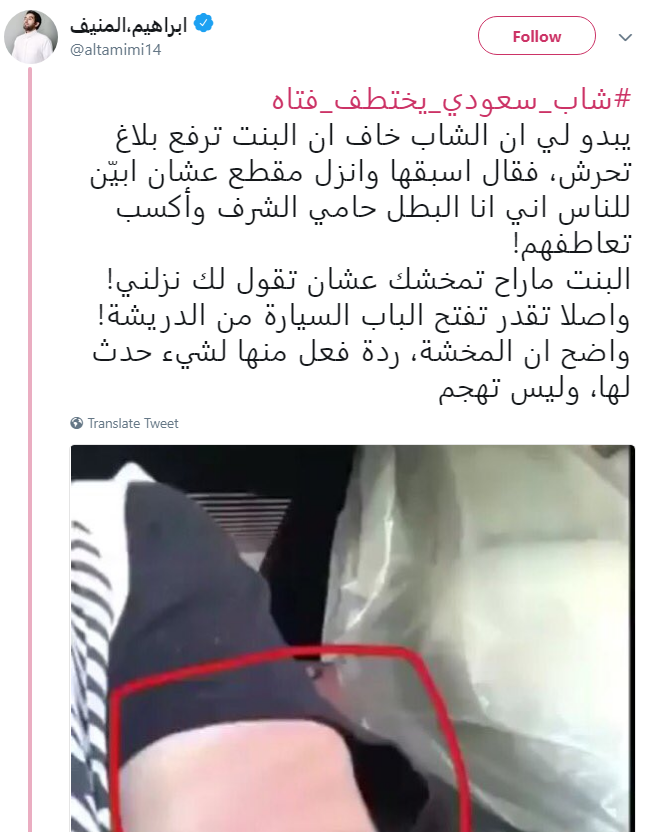 The video came shortly after hashtag شاب سعودي يختطف فتاة “A Saudi man kidnaps a girl” went viral among Saudis, as a Saudi woman accused a driver of kidnapping and sexually harassing her.