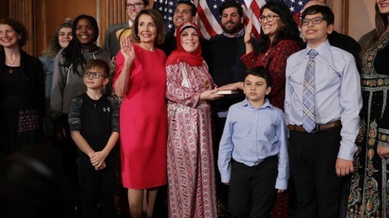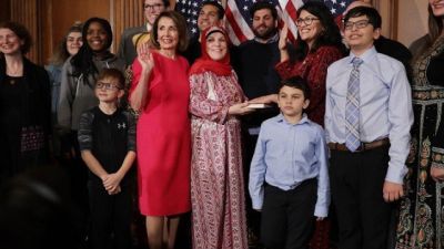 Speaker of the House Nancy Pelosi with Rep. Rashida Tlaib and her family in the Rayburn Room at the U.S. Capitol January 03, 2019 in Washington, DC. (AFP)