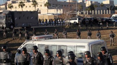 Jordanian police stand guard in front of the American embassy in Amman during a demonstration against the US president's decision to recognise Jerusalem as the capital of Israel, on December 8, 2017 (Ahmad Abdo/AFP)
