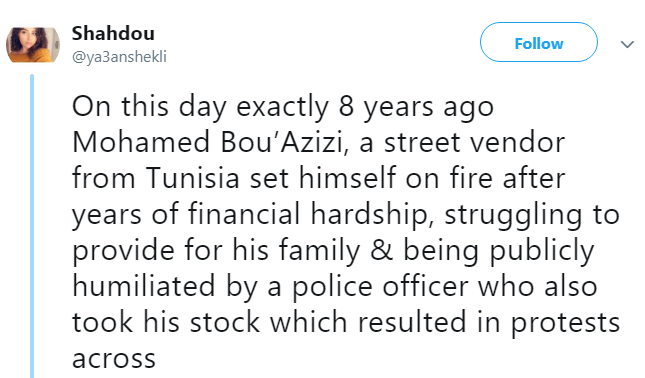 On December 17, 2010, Tunisians woke up on the news of a street vendor that set himself in alight in the tourist town of Sidi Bouzid after his vegetable cart, and his only source of income, was confiscated by a policeman. The young man was identified shortly after as Mohammed Bouazizi.