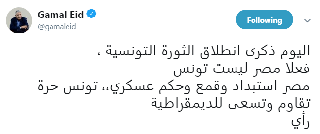Translation: “Today is the remembering of Tunisia’s revolution. Egypt is not Tunisia. Egypt is tyranny, oppression and military rule while Tunisia is free. It fights for freedom and seek democracy.”
