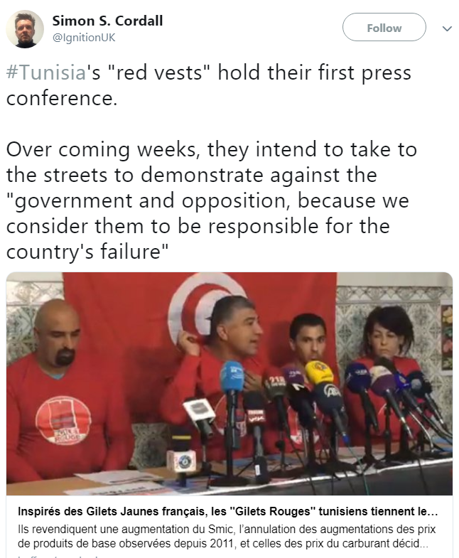 This year Tunisians remember Bouazizi’s self-immolation with organizing protests in several parts of the country. Inspired by the Yellow Vests waves in Paris, Tunisian activists have launched their “Red Vests” movement.