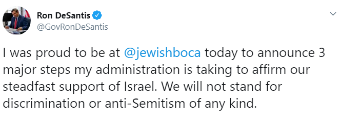 In fact this was not of something new for DeSantis, as has expressed his support to Israel repeatedly during his campaign with promises to push for support for the “Jewish population”. Not only this, DeSantis has also announced on Tuesday his first overseas trip to Israel in May 2019 to pledge millions of dollars to Jewish schools.