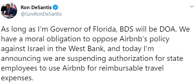 On Tuesday, the Republican governor appeared at the Jewish Federation of South Palm BeachCounty to announce his intention to deal with Airbnb’s decision in suspending the Israeli settlement listings built on the occupied Palestinian territories in the West Bank.