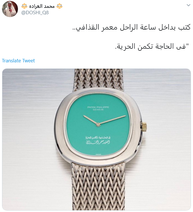 Translation: “In times of need, will you find freedom” is written in the watch of late Muammar Gaddafi.”