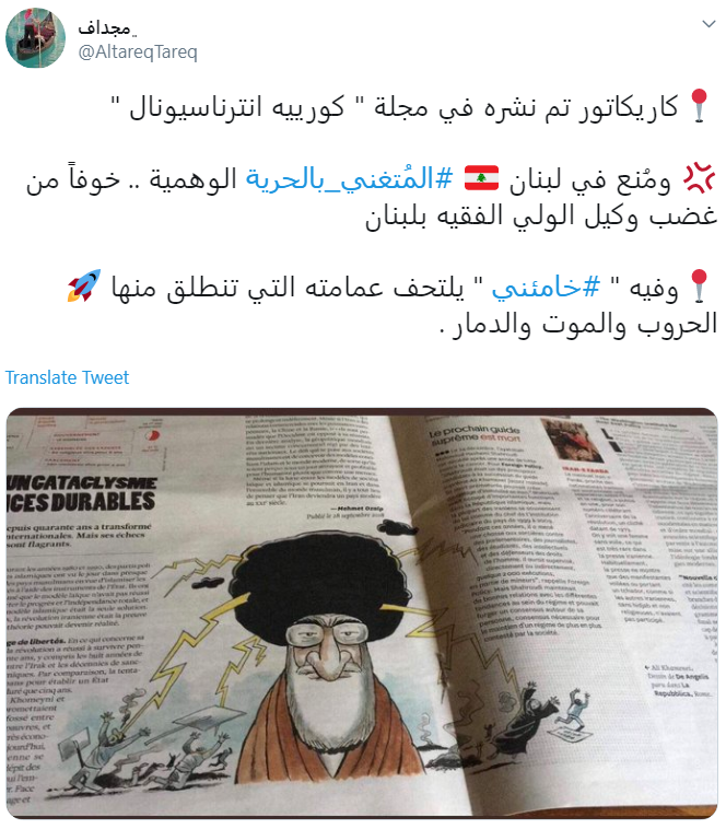 Translation: “A cartoon published in "Courrier International". It was censored in Lebanon, the braggart about freedoms amid fears of upsetting Wilayat al-Faqih in Lebanon. Khamenei appears wearing his turban from which wars and destruction spark off.”