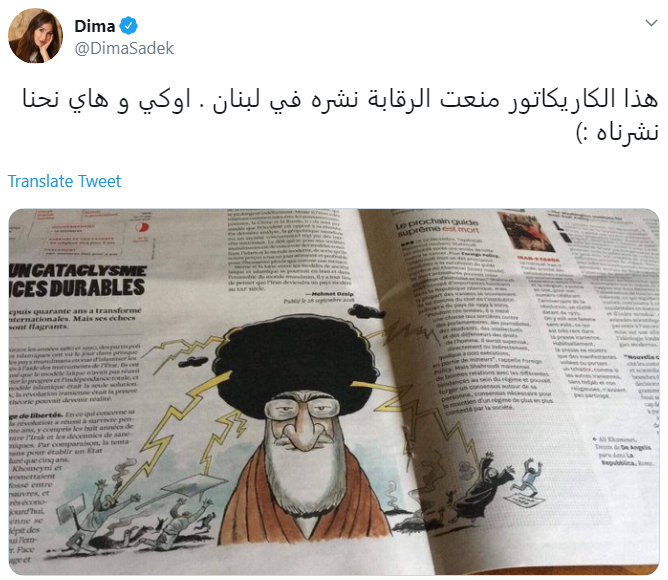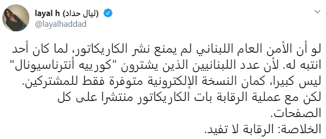 Translation: “If the Lebanese general security did not censor the cartoon, no one would have noticed it. Because the number of Lebanese who buy the “Courrier International” is not that big, also the original edition is available online for the newspaper’s subscribers. With the censorship decision, the cartoon is now viral on all pages. Conclusion: Censorship is not helpful.”