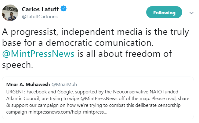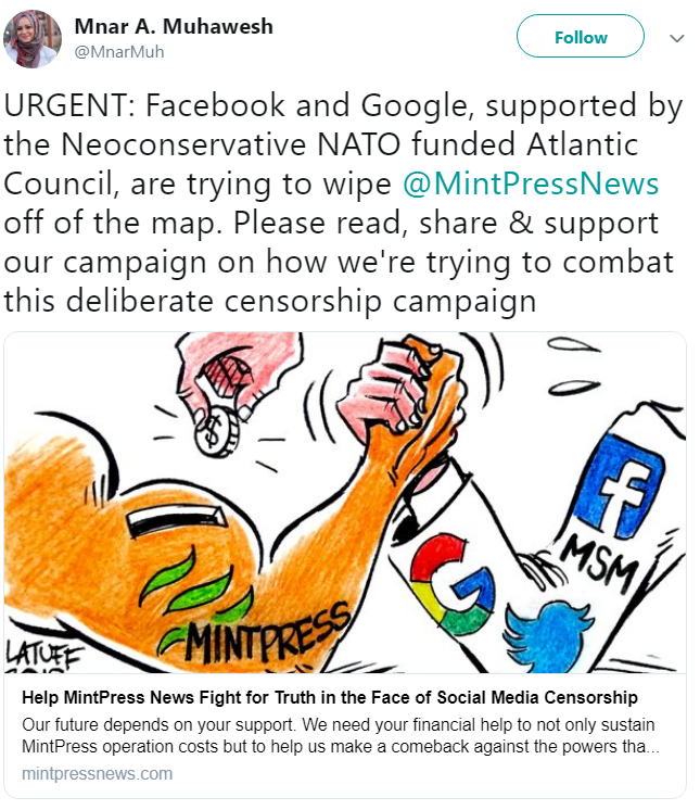 On top of this, the platform’s founder, Manar Muhawesh, accused the NATO-funded Atlantic Council of helping to suppress Mintpress content after partnering with Facebook. There does not seem to be any information to support this claim.