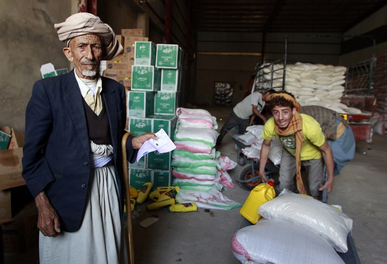 Men recieve humanitarian aid in Sanaa from the World Food Program on March 16, 2016.  Food, water, and electricity shortages have been dire for many Yemenis since the start of the civil war.  (AFP/Mohammed Huwais)
