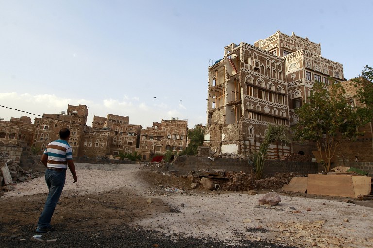 Sanaa's UNESCO-listed historic buildings are shown damaged following airstrikes on March 23, 2016 that were reportedly carried out by the Saudi-led coalition.  The capital city's unique historic district has been under great risk of destruction since the start of the war, and repeated pleas by UNESCO officials seemingly haven't been enough to halt the damage.  (AFP/Mohammed Huwais)