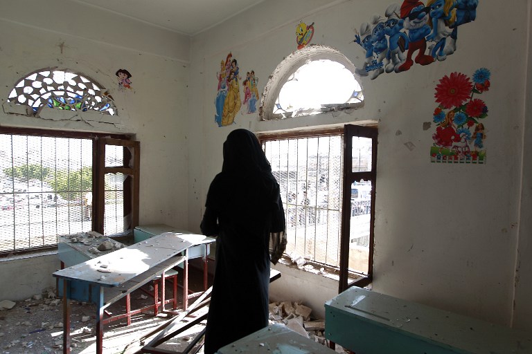 A woman inspects the damage to a school building after an airstrike in Sanaa that was reportedly carried out by Saudi-led forces on March 23, 2016.  The civil war has been especially painful for Yemen's children - the UN estimates that hundreds have been killed by the fightining, and hundreds of thousands of others face malnutrition.  (AFP/Mohammed Huwais)