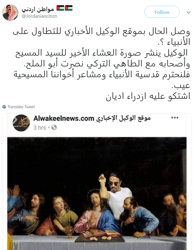 Translation: “Al Wakeel news website dared to offend the prophets? Al Wakeel posted the Last Supper painting photoshopped with the Turkish Salt Bae. Let us respect the sanctity of the prophets and respect our Christian brothers. They [the website] should be charged with blasphemy.”