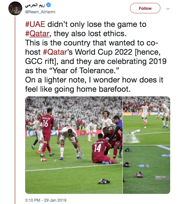Ouch. The Qatari football team just beat the UAE 4-0 in a football match in Abu Dhabi, the capital of the UAE. This comes against mounting tension following the blockade of Qatar by GCC member states and allies, as well as Doha’s controversial hosting of the World Cup in 2022.