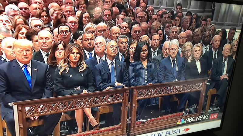 At the state funeral of the 41st president of the United States held in Washington's National Cathedral, videos captured the moment when the Carters, the Clintons, Obamas and Trumps gathered in the front row to attend the funeral's ceremony.