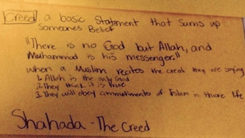 A Tennessee mother in Maury County was infuriated when one of her child’s lessons on Islam included writing, “There is no God but Allah” while learning about the Five Pillars of Islam.