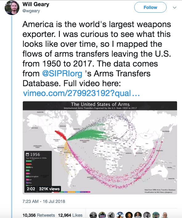 A video created by Will Geary, a US Data scientist and visualizer, outlines the flow of weapons trade from the US to the rest of the world in the time period between 1950 to 2017.