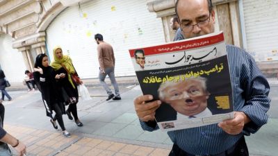 An Iranian man reads a copy of the daily newspaper 'Omid Javan' bearing a picture of U.S. President Donald Trump with a headline that reads in Persian "Crazy Trump and logical JCPOA (Joint Comprehensive Plan of Action)" (AFP)