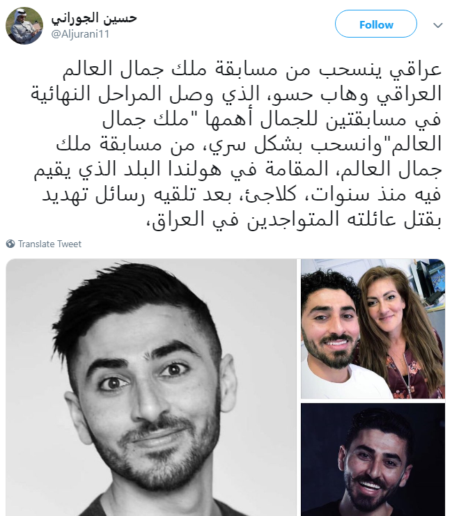 Translation: “Wahab Hesso, an Iraqi decides to pull out from Mister World pageant. He reached the finales of top two prominent beauty pageants; now he is pulling out secretly from the contest that is being held in Netherlands where he has been living for years as a refugee after receiving death threats to his family in Iraq.”