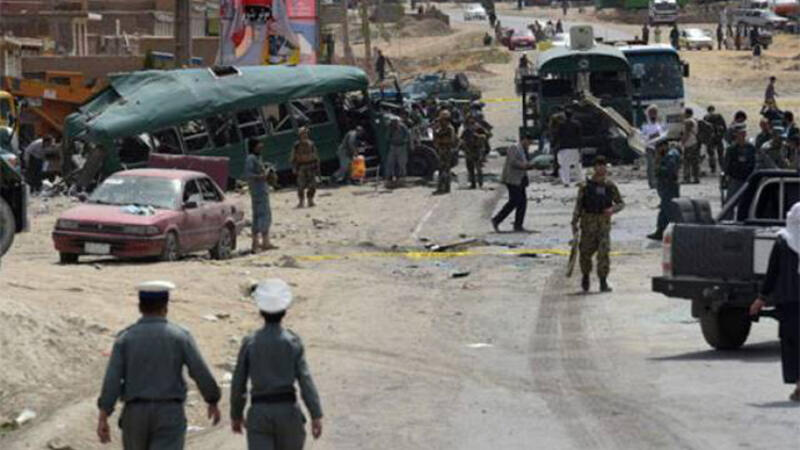 Afghan security personnel gather near the wreckage of buses which were carrying police cadets, at the site of a bomb attack on the outskirts of Kabul on June 30, 2016. (AFP)