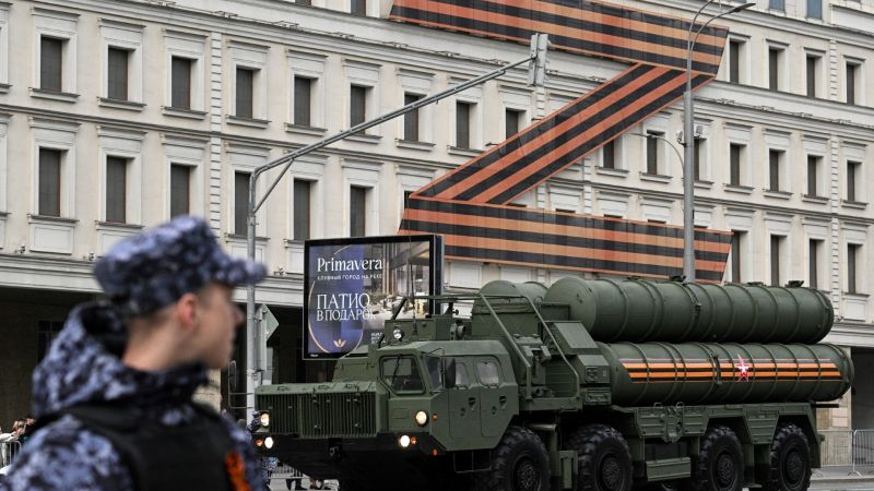 A Russian missile S-400 Triumf system vehicle moves along the Garden Ring road in front of a huge Z letter, a tactical insignia of Russian troops in Ukraine. (Photo by Kirill KUDRYAVTSEV / AFP)