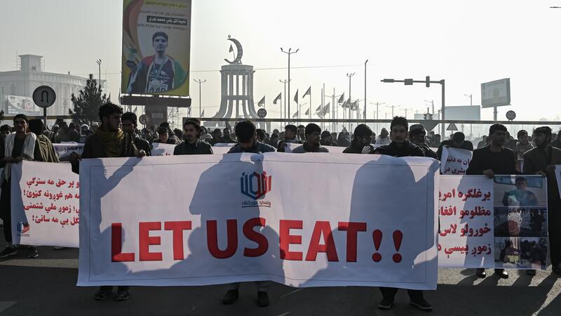 Protesters chanted anti-US slogans and carried banners and posters with slogans such as "Our money is our right," "People are voicing against hunger," "Does the world want a humanitarian catastrophe in Afghanistan?" "Why don't you release our funds?" "Do Afghans get no attention from the UN and human rights organizations?"