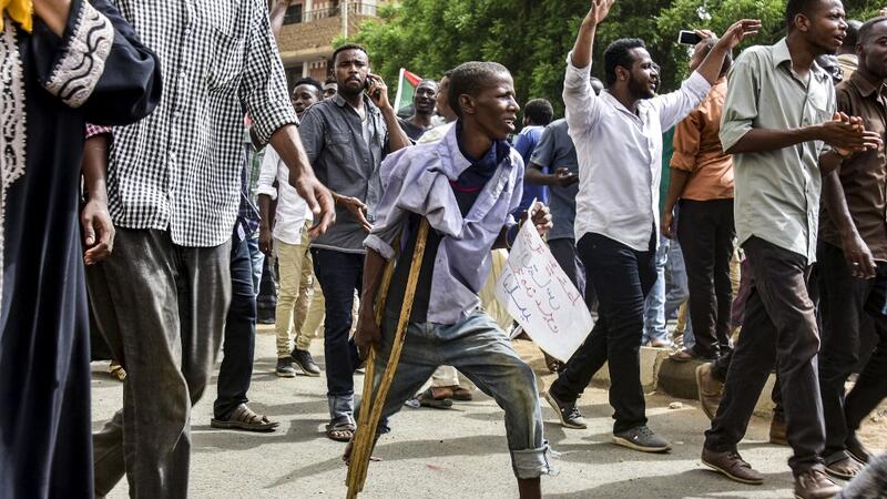 A Sudanese protester walking with a crutch joins others in a march during a mass demonstration against the country's ruling generals in the capital Khartoum's twin city of Omdurman on June 30, 2019.  Ahmed MUSTAFA / AFP
