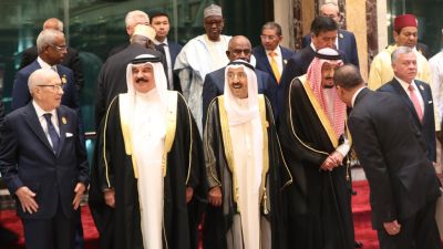Front row from L to R: Tunisian President Beji Caid Essebsi, Bahrain's King Hamad bin Isa al-Khalifa, Kuwaiti Emir Sheikh Jaber al-Ahmad al-Sabah, Saudi King Salman bin Abdulaziz and Jordan's King Abdullah II at OIC. (AFP)