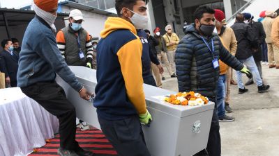 Workers carry the coffin of Hardev Singh, who was killed on the January 17 drone attack in Abu Dhabi, into an ambulance at the Sri Guru Ram Dass Jee International Airport on the outskirts of Amritsar on January 21, 2022. (Photo by NARINDER NANU / AFP)