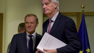 EU Brexit chief negociator Michel Barnier (R) holds the "draft agreement of the withdrawal of the United Kingdom of Great Britain and Northern Ireland from the European Union" while arriving with European Council President Donald Tusk for a press conference at the European Council in Brussels (AFP)