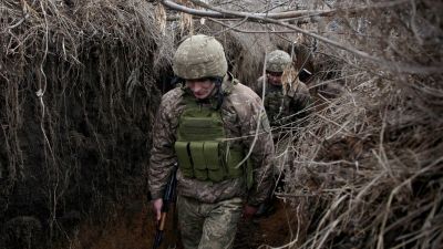 Servicemen of Ukrainian Military Forces walk as they keep position on the front line with Russia backed separatists, near Novolugansk, in the Donetsk region, on February 17, 2022. (Photo by Anatolii STEPANOV / AFP)