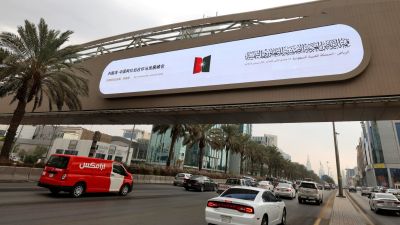 A picture taken on December 7, 2022 in Riyadh shows a billboard welcoming the Chinese president ahed of his to Saudi Arabia. Chinese President Xi Jinping will make a three-day visit to Saudi Arabia this week, meeting the king and de facto ruler of the world's biggest oil exporter. (Photo by Fayez Nureldine / AFP)