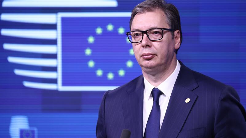 Serbian president Aleksandar Vucic gives a press conference after the EU-Western Balkans leaders' meeting in Brussels on June 23, 2022. (Photo by Kenzo TRIBOUILLARD / AFP)