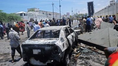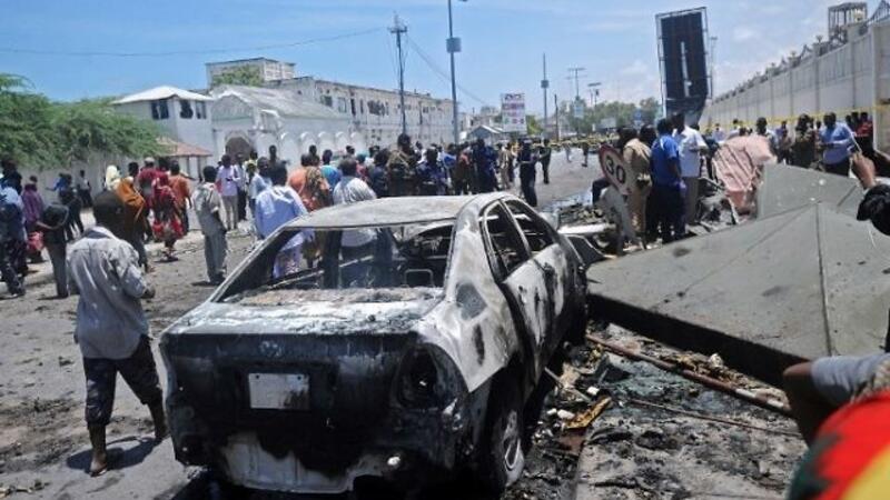 People stand at the site of a car bomb near a restaurant near the Somali ministry of internal security in Mogadishu on April 5, 2017. (AFP Photo)