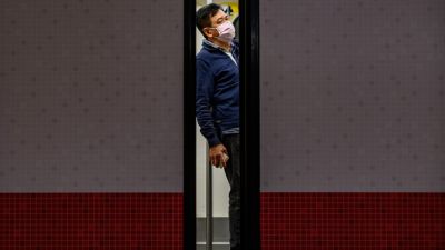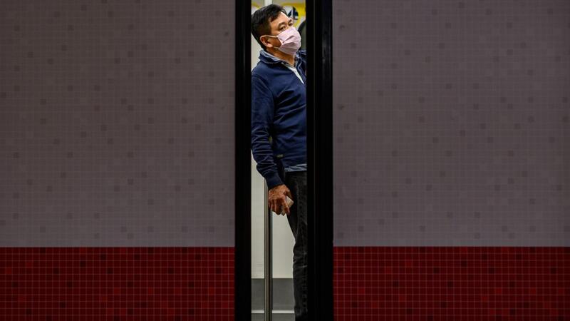 A man wears a face mask as a preventative measure against the COVID-19 coronavirus, as he stands in a train at Mong Kok MTR station in Hong Kong on February 14, 2020. The death toll from China's virus epidemic neared 1,400 on Friday with six medical workers among the victims, underscoring the country's struggle to contain a deepening health crisis. Philip FONG / AFP