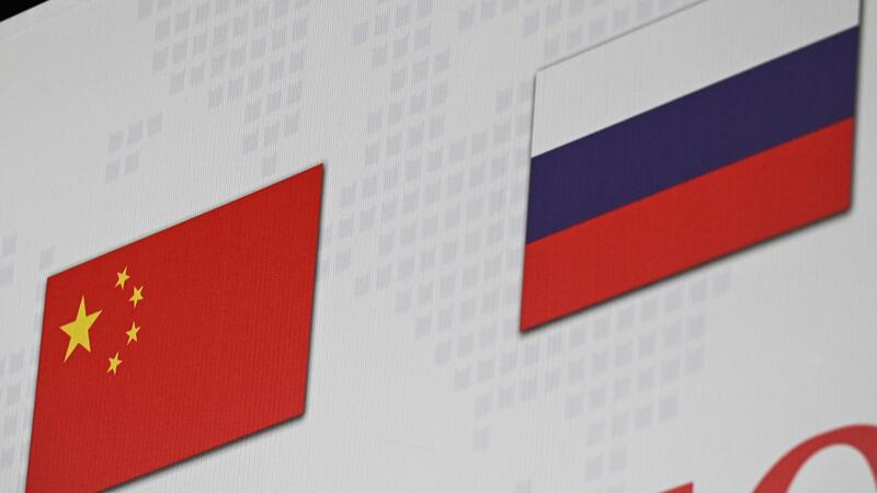 The Chinese and Russian national flags (R) are seen on the international logistics billboard in Ritan International Trade Center in Beijing on March 22, 2022. (Photo by Jade GAO / AFP)