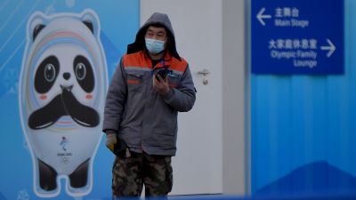 A worker walks past a depiction of mascot Bing Dwen Dwen near the Beijing Medals Plaza, a non-competition venue for the 2022 Winter Olympic Games where winners will be awarded their medals, in Beijing on January 3, 2022. (Photo by Noel Celis / AFP)