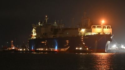Liquefied natural gas (LNG) tanker, Golar Tundra (Rear R), a floating storage and regasification unit, enters the port of Piombino, Tuscany, late on March 19, 2023, after it departed from Singapore, crossed the Suez Canal to enter the Mediterranean. AFP